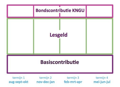 Om het mogelijk te maken voor leden om gedurende het seizoen (augustus-juli) te kunnen uitstromen, verdelen we het jaar in vier termijnen. Door deze termijnen zijn leden flexibeler om gedurende het jaar het aantal trainingsuren aan te passen (verhogen of verlagen) of eventueel op te zeggen. Het betekent wel dat er in een jaar vier factuurmomenten zijn.